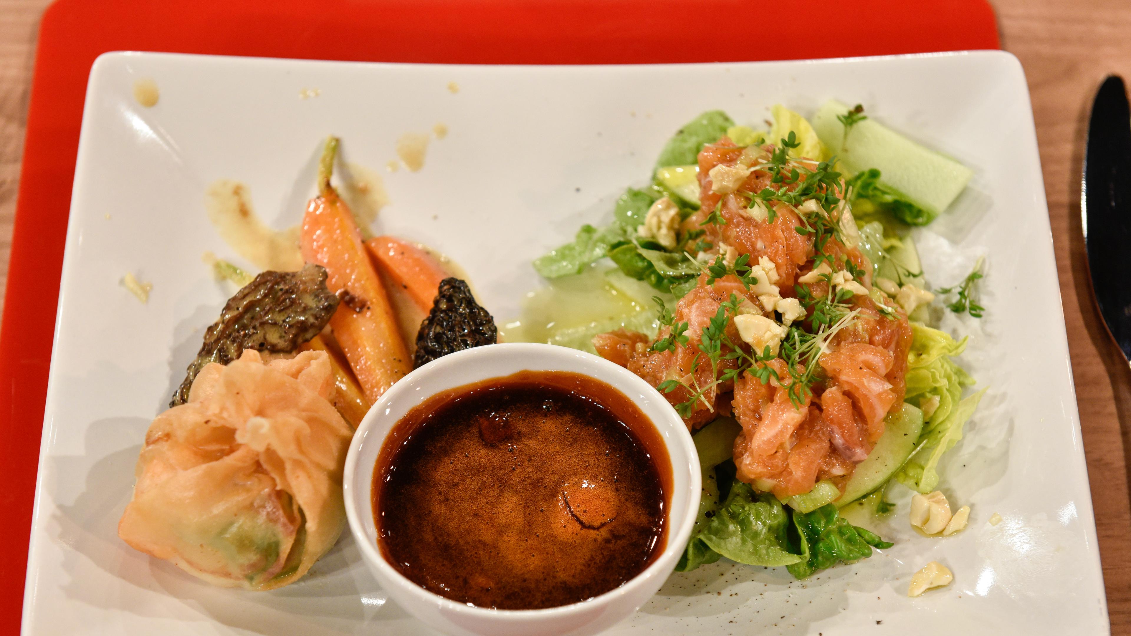 Lachstatar mit avocado feldsalat radieschen und senf dill dressing. Die küchenschlacht blumenkohl steak. Lachstatar auf dem kartoffelschaum siehe rezept kartoffelschaum in tiefen tellern anrichten.
